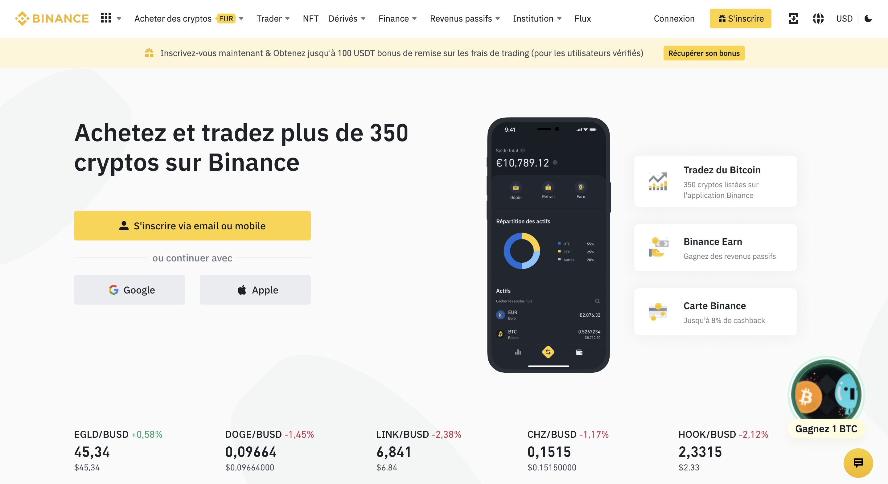 ì ce jour, Binance est la plus grande plateforme d'échange de cryptomonnaies en termes de volume. En mai 2022, l'Autorité des marchés financiers (AMF) enregistre Binance comme Prestataire de Services sur Actifs Numériques (PSAN). En plus de proposer une plateforme d'échange de cryptomonnaies, Binance propose le trading des Futures, l'achat/vente des Fan Token, du savings, du staking, l'achat/vente de NFT ou encore un Launchpad.