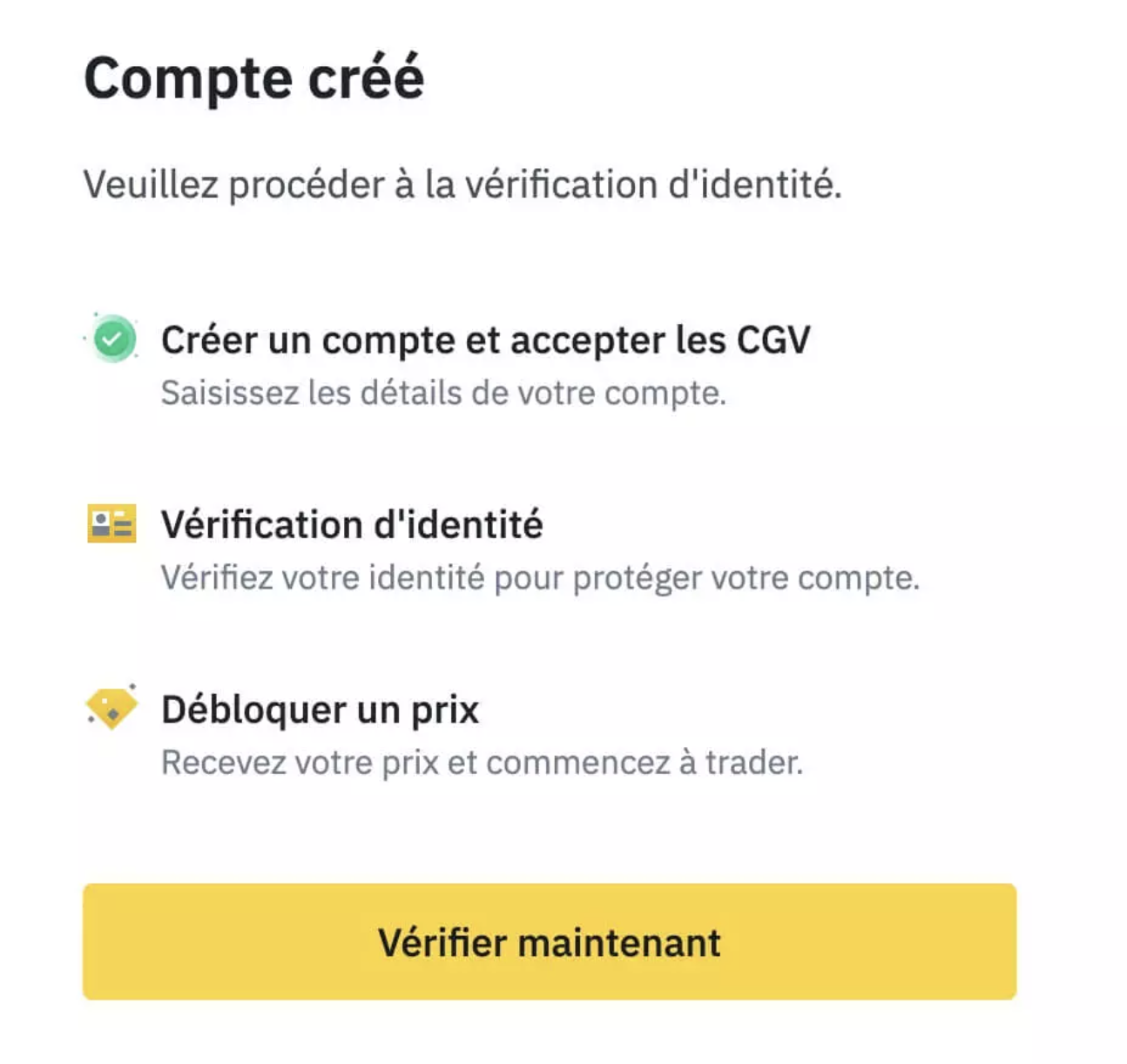 Une fois votre identité vérifiée, vous recevez un email de confirmation. Vous verrez également une petite pastille verte sur votre compte Binance, signifiant que la vérification s'est bien déroulée.