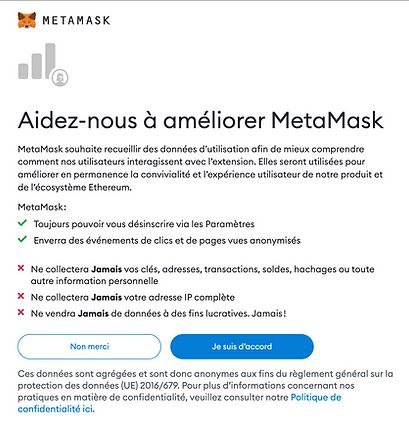Vous n'êtes pas obligé d'accepter, dans ce cas, cliquez sur "Non merci". Si vous souhaitez que Metamask recueille des données concernant l'utilisation de votre portefeuille, cliquez sur "Je suis d'accord".
