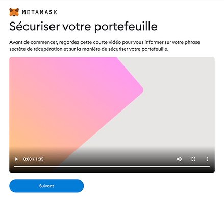 Avant de poursuivre le paramétrage, Metamask vous propose une courte vidéo pour vous donner des informations sur votre phrase secrète de récupération et sur la façon de sécuriser votre portefeuille.