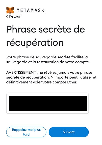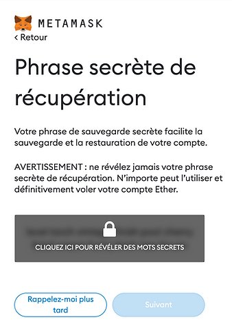 Cette étape va vous permettre de récupérer votre phrase secrète. Cela permet de restaurer votre compte si nécessaire.