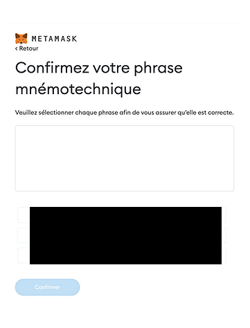 Metamask veut s'assurer que vous avez noté vos 12 mots correctement. Cliquez sur les mots dans le même ordre que ceux repris dans votre phrase secrète de récupération.