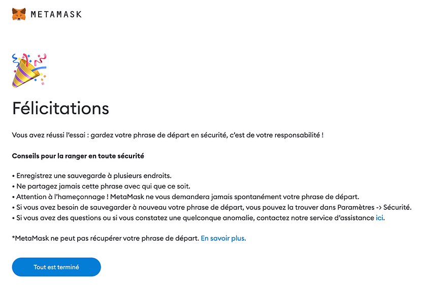 Félicitations ! Votre compte Metamask est créé, paramétré et prêt à l'emploi.
