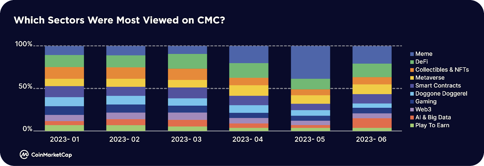 Il s'agit sans doute de l'un des secteurs qui a fait le plus de bruit durant ce premier semestre 2023. Le secteur des mèmes a connu une augmentation significative de popularité en avril et mai de cette année. Notamment, en raison de la "memecoins season" menée par une nouvelle crypto appelée PEPE.