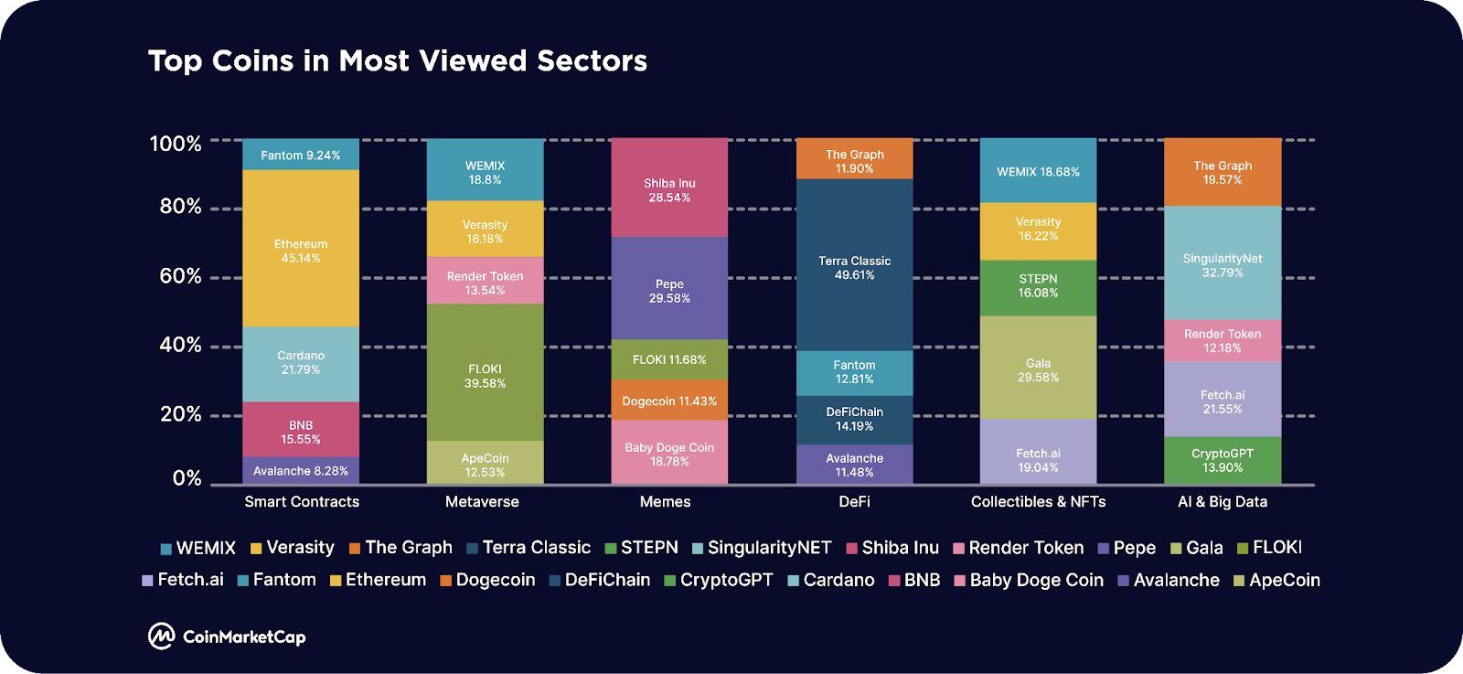 Dans cet article, nous aborderons les secteurs et les cryptomonnaies les plus consultées suite à un rapport de Coinmarketcap sur l'état de marché des cryptomonnaies du premier semestre 2023.